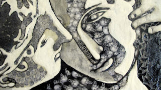 Detail "Las 3 Gracias" Contemporary perception Bees Wax, Oil & Collage on wood. 48x48 inch. by Fiorella Podesta. |