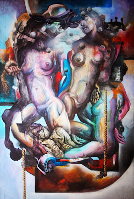 En esta obra Carlos Palomino camina seguro entre seres, mutaciones y dimensiones de otro siglo, que aguzan la protesta clamando por la vida, sostenidas entre ataduras de cuerdas y resistencia de poleas....cual profeta en delirio iracundo busca incansable entre los gestos duros, formas mecánicas, la verdad pura y los instintos que aún yacen en la hondura de todo ser viviente...